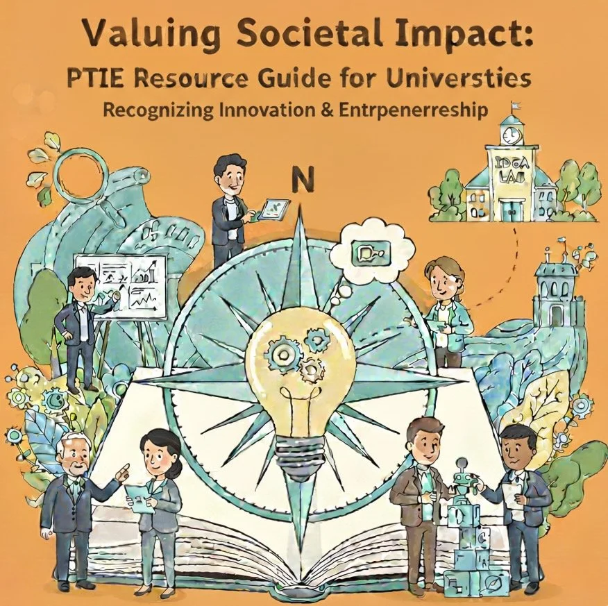 Cover page for 'Valuing Societal Impact: PTIE Resource Guide for Universities,' featuring illustrations of researchers, a university building, and scientific equipment, emphasizing innovation and entrepreneurship.
